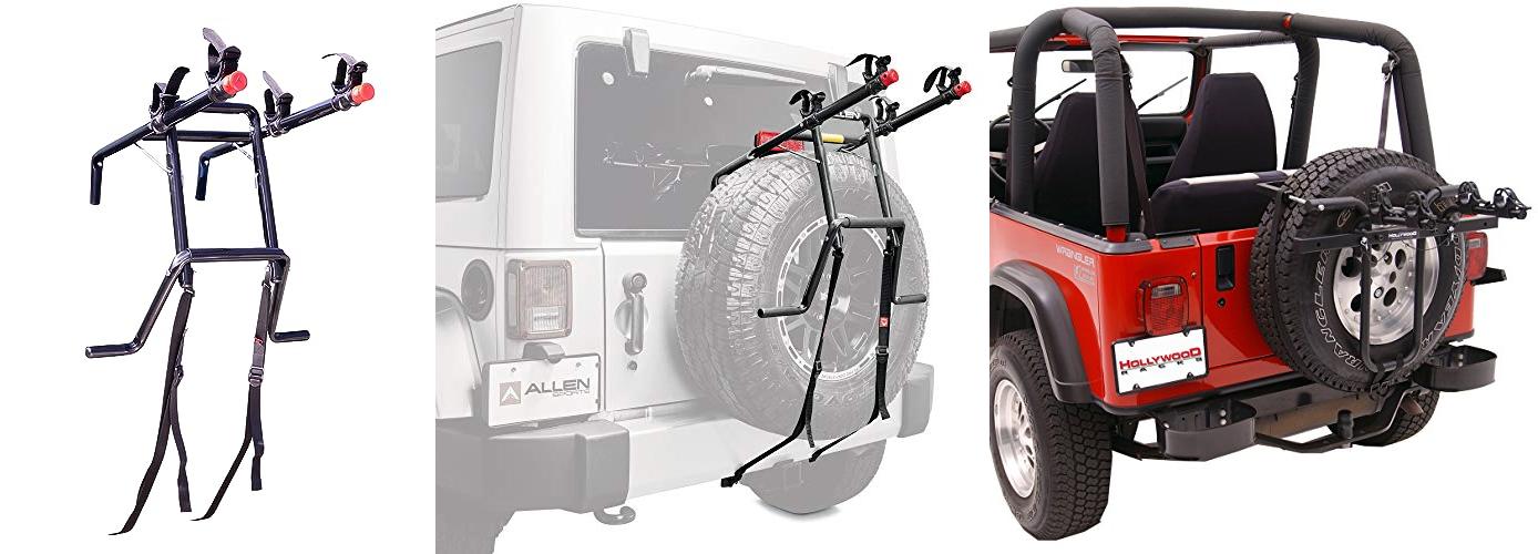 - Spare Tire Racks: These use your Wrangler’s spare tire on the back. They are a good option if you don’t have a hitch. They are usually for carrying one or two bikes.