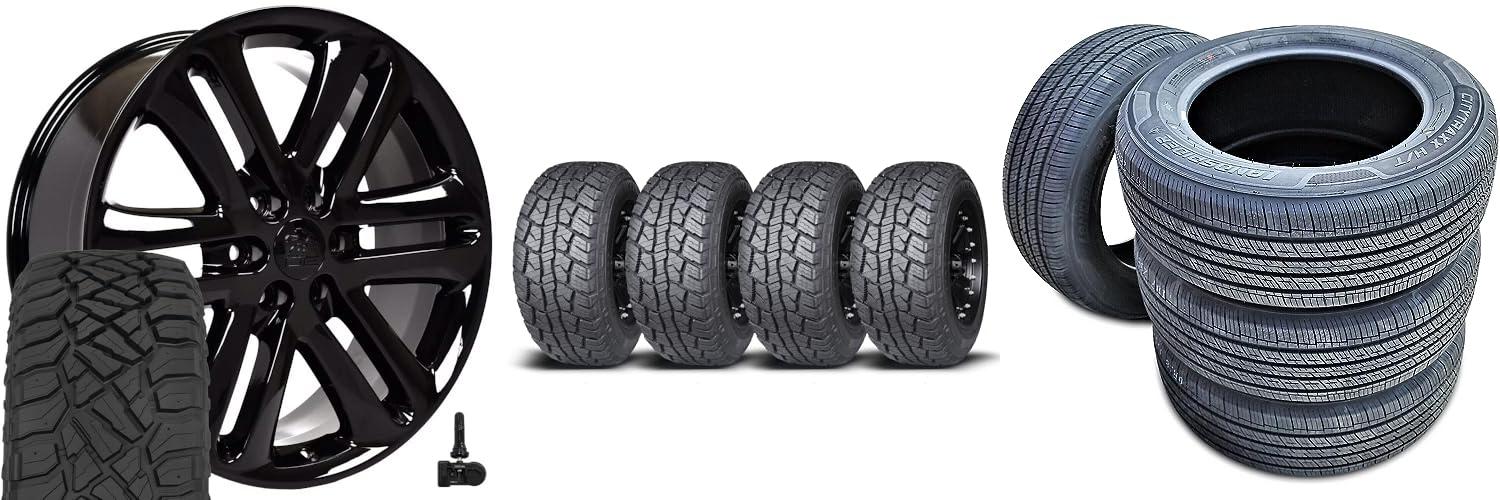 Upgrade your truck’s look with the OE Wheels FR76 rim and tire set! These 22-inch rims come with tires. They fit F-150 style trucks. The rims are a sleek gloss black. They have a Hollander number of 3918. The tires are TerraMax RT 285/45-22. This set includes four wheels and tires. They are ready to install on your truck. These wheels are made to fit many Ford and Lincoln models from 2003 to 2025, including the Expedition and Navigator. The set also includes TPMS sensors. These sensors make sure your tire pressure is correct.