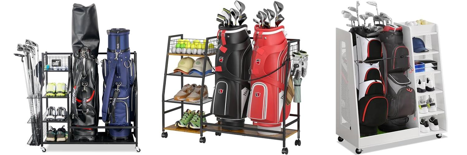 - Optimal storage for all your golf gear. The rack has space for bags, balls, shoes, and accessories.