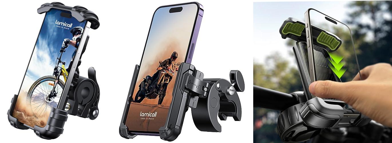 The Lamicall Bike Phone Holder and Motorcycle Mount is designed to keep your smartphone secure and accessible while you ride. This handlebar cell phone clamp works for a wide range of phones, including the latest iPhones and Samsung Galaxy models, fitting devices from 4.7 to 6.8 inches.