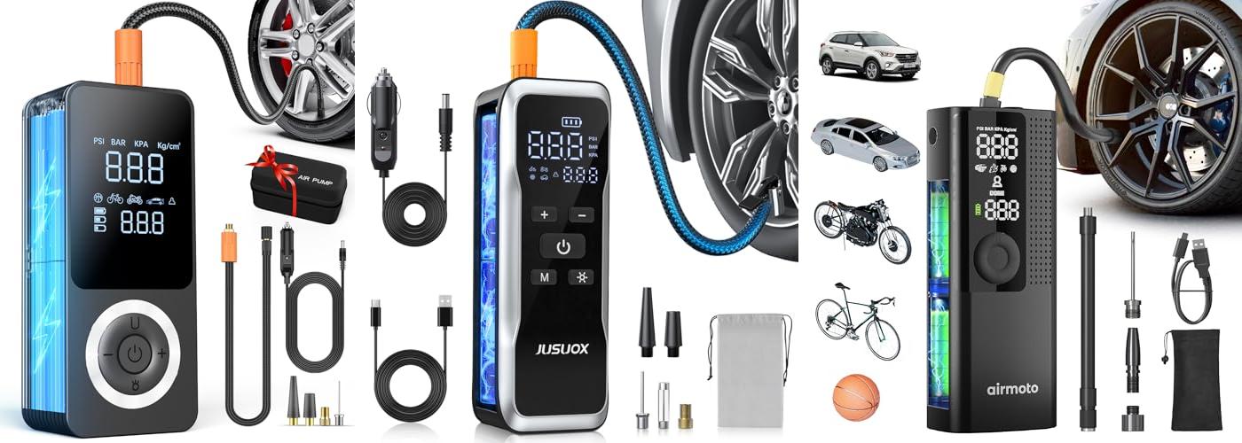 The JUSUOX Tire Inflator is a handy tool for keeping your tires at the right pressure. It’s a portable air compressor that works for cars, bikes, motorcycles, and balls. This inflator is easy to use and has many helpful features. It can run on a rechargeable battery or your car’s power outlet. It’s designed to make inflating tires simple and safe.
