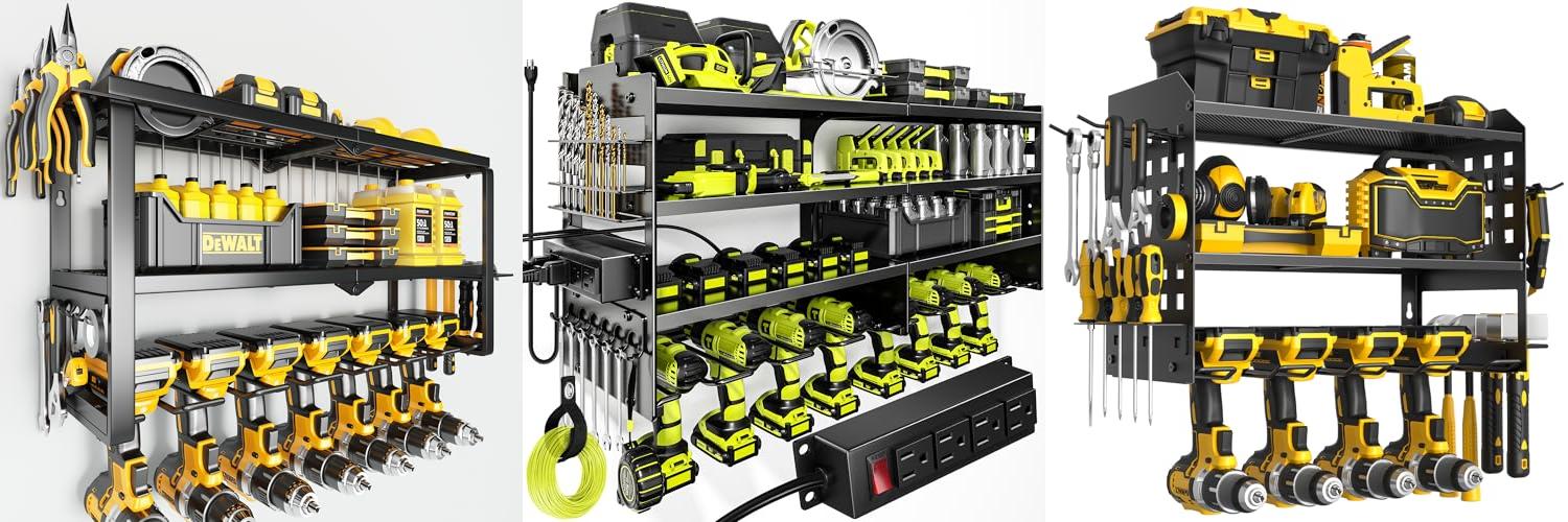 1. Power Tool Organizer Wall Mount – 150Lbs Load 3 Layers Storage Rack with 7 Drill Holders for Drills Cordless Tools. Heavy Duty Iron Garage Tool Organizer Storage for Workshop Shed Pegboard Basement